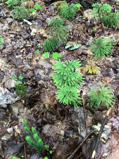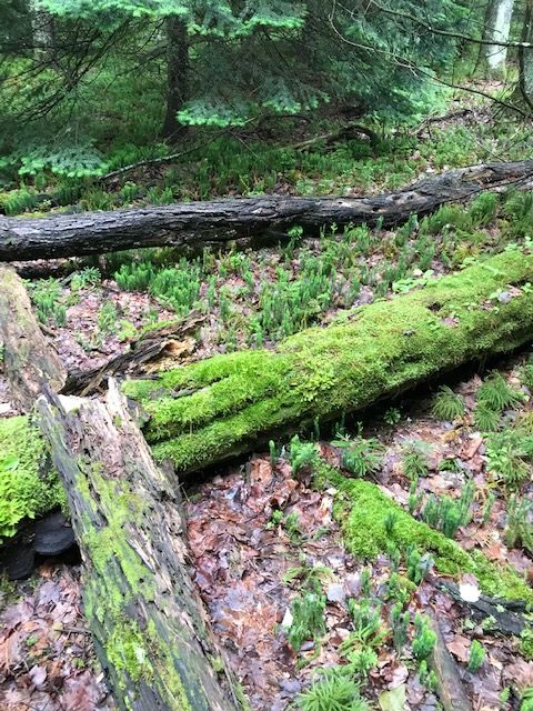 Wet woods Rainy day hike Scan vibrant green colors Mosses cover logs / forest floor Peaceful!