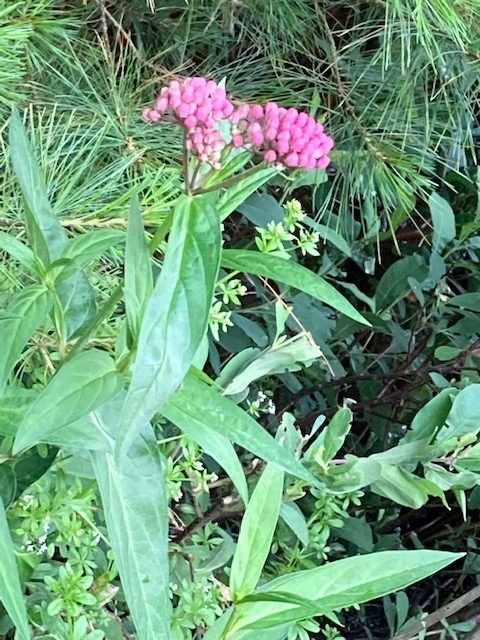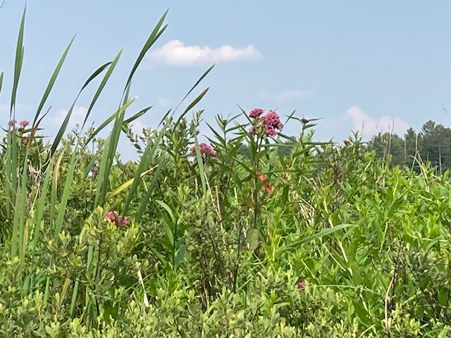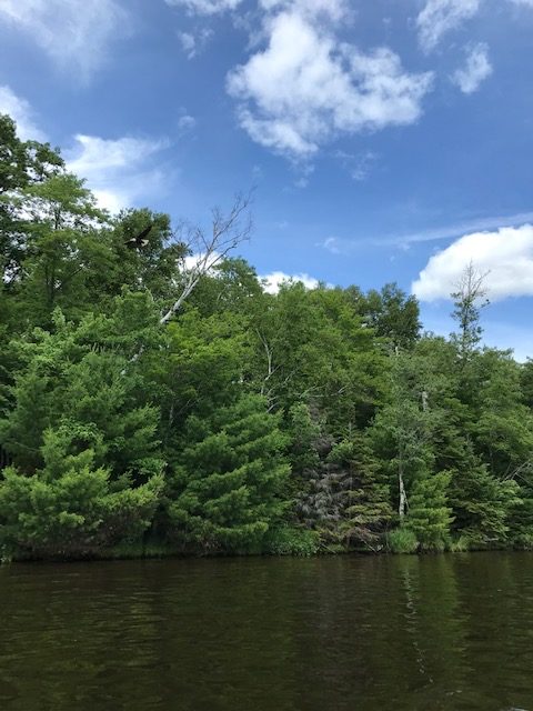 Eagle Flying away ! Now blooms …pickerel weed, Swamp milkweed seen from our canoe. Findings !
