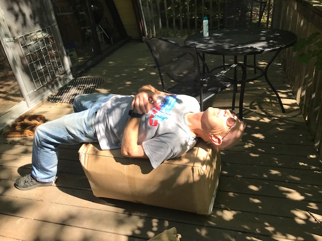 Survey Downed trees. Unload Car. Got new mattresses! Firsts ... walk, swim, kayak, paddleboat ! Miss Rey !
