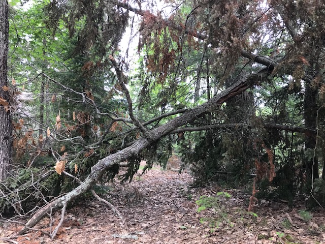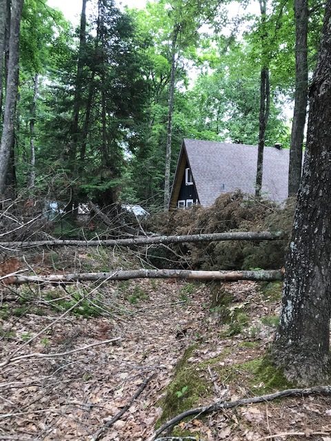 Wild winds 30 mile gusts ! Crossing lake a challenge ! Later crew clears path of downed trees. Muscle !